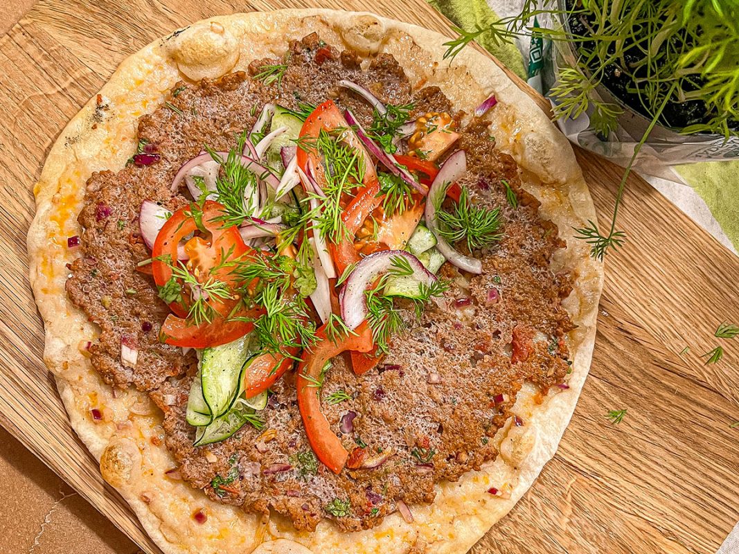 Her bages kødfarspizza på Bluegaz Pizzasten.