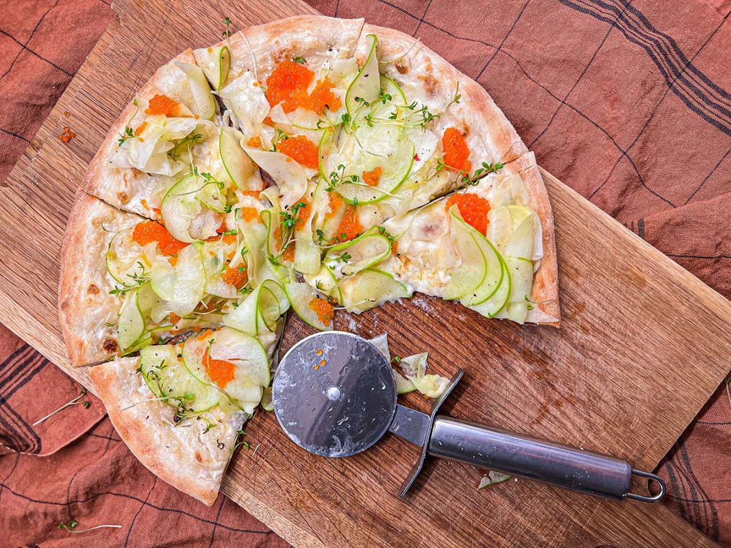Opskrift – Pizza bianco med æble, kålrabi & tangkaviar
