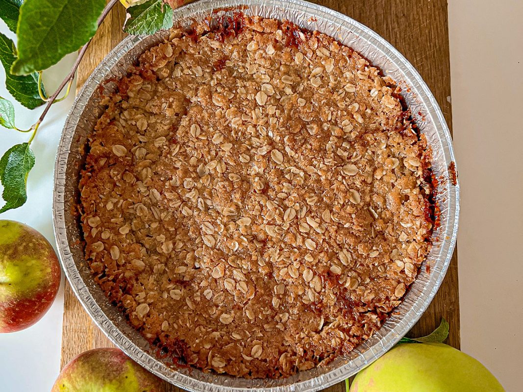 - Bland havregryn, hvedemel og sirup i smørret, så du får en smuldrende “dej”.