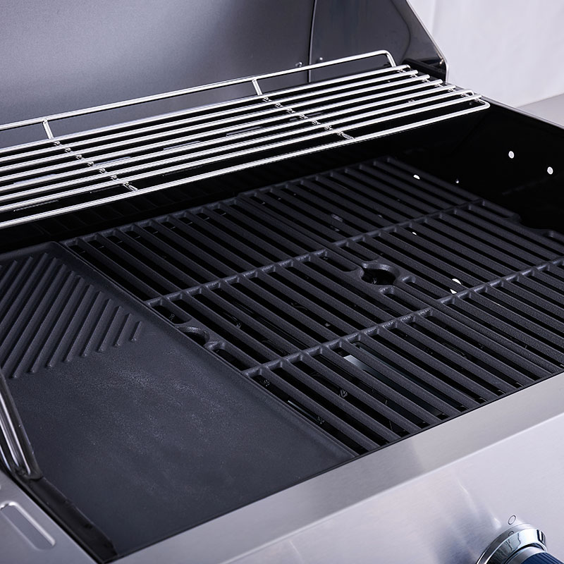 Med en rummelig grillyta på 61 x 44 cm kan du nemt tilberede mad til store selskaber. Z6 er udstyret med to robuste grillgaller i støbejern, et materiale kendt for sin varmeopbevaringsevne, jævn varmefordeling og lange holdbarhed. En tredjedel af grillytan er desuden blevet erstattet med en stegeplade i støbejern, hvilket åbner op for mange forskellige madlavningsmuligheder. På stegepladen kan du tilberede alt fra saftige burgere og sprød bacon til grøntsager, skaldyr eller pandekager direkte på grillen. Den medfølgende varmehylde sikrer, at maden forbliver varm, indtil det er tid til servering.